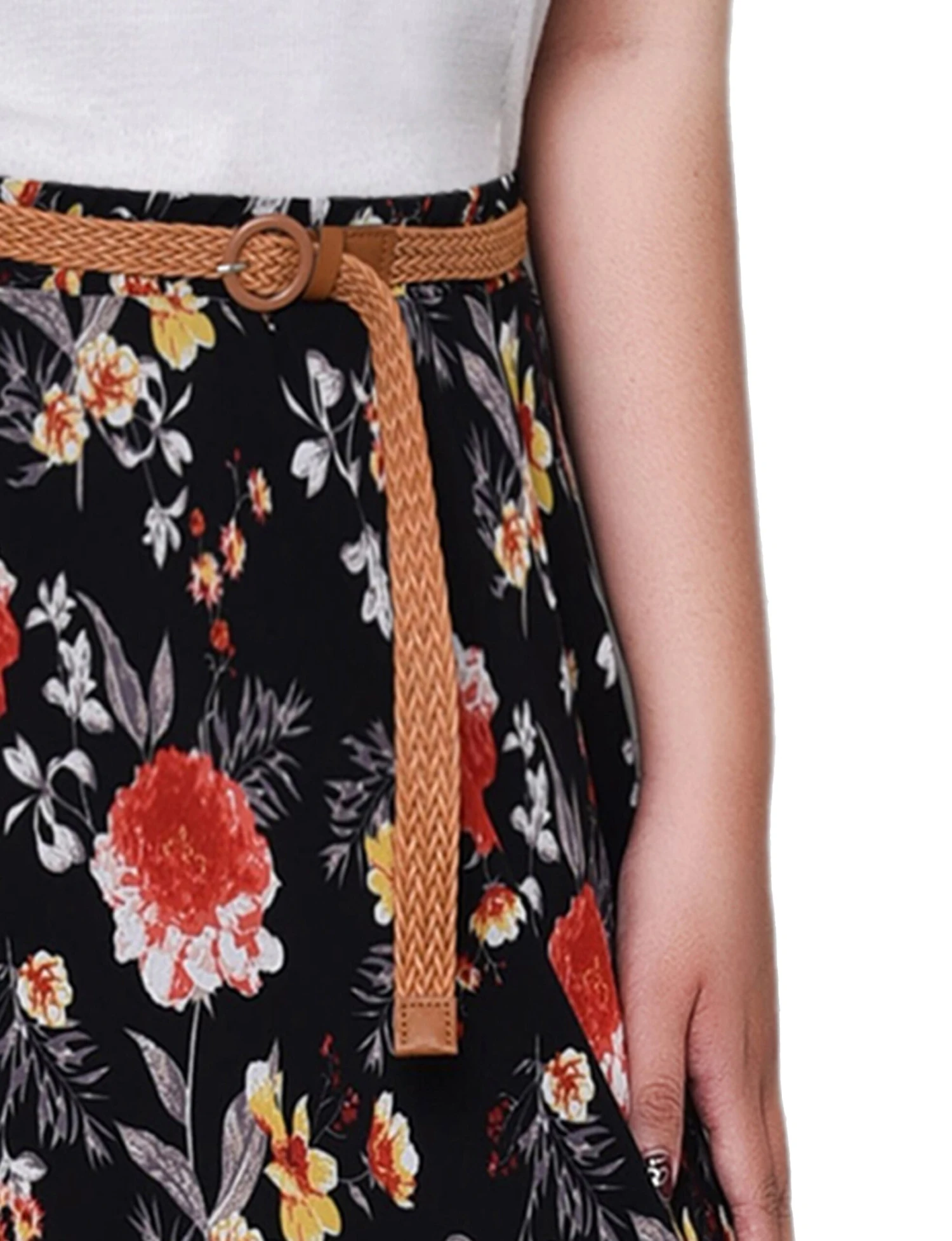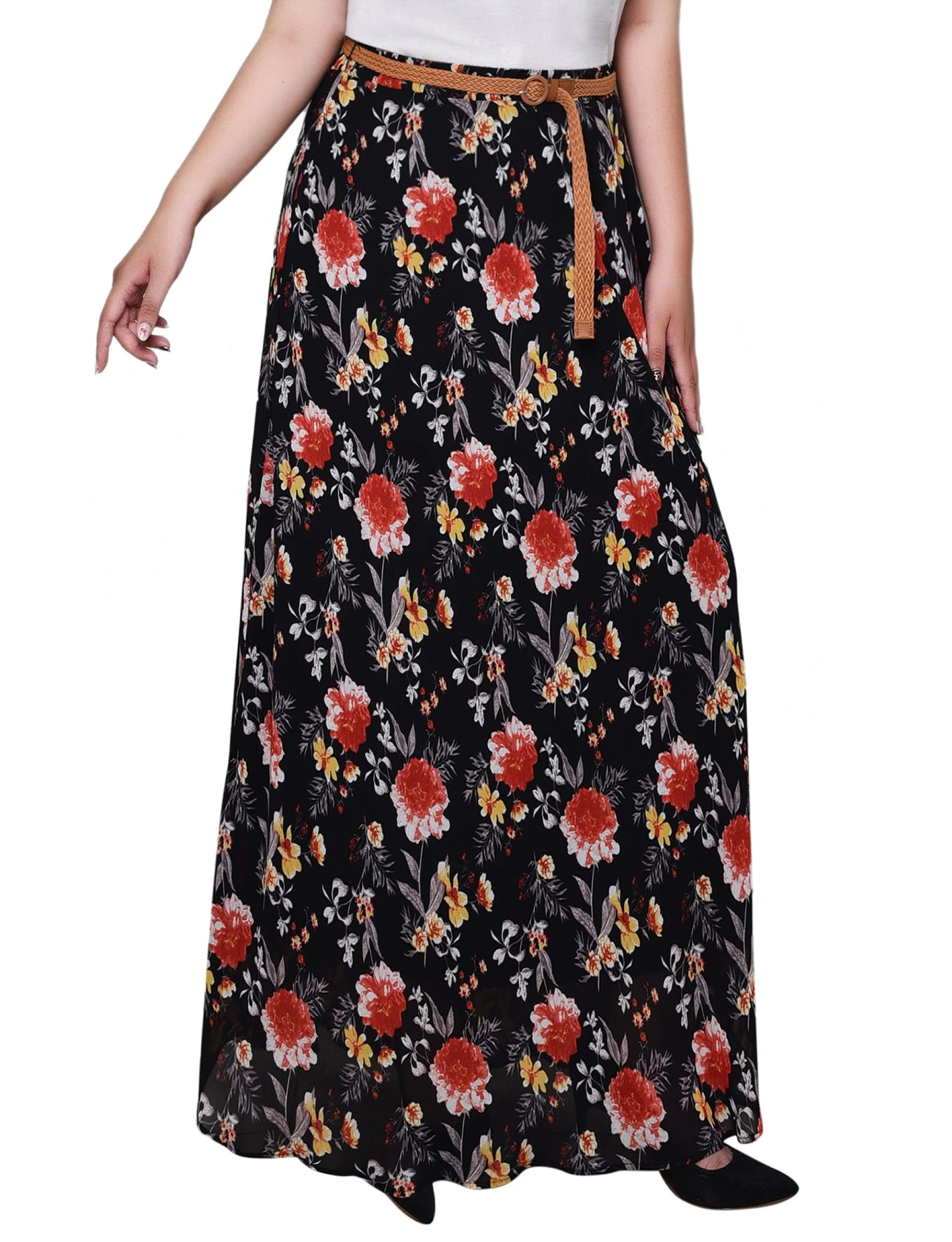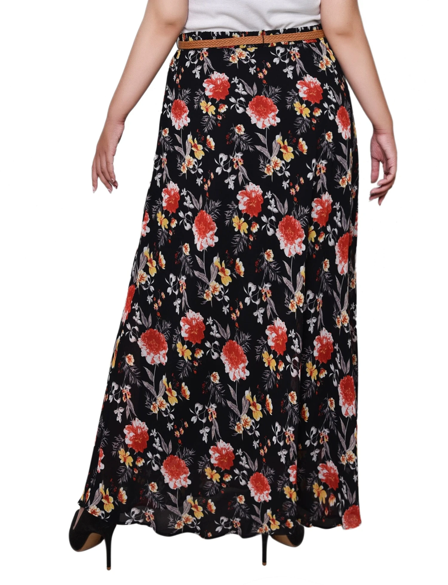 Finding a piece that transitions seamlessly from a professional daytime look to an elegant evening ensemble can be a challenge. This Floral Chiffon Maxi Skirt solves your wardrobe dilemmas with its sophisticated black, red, and gold palette and its lightweight, flowy silhouette designed specifically for a flattering plus-size fit.