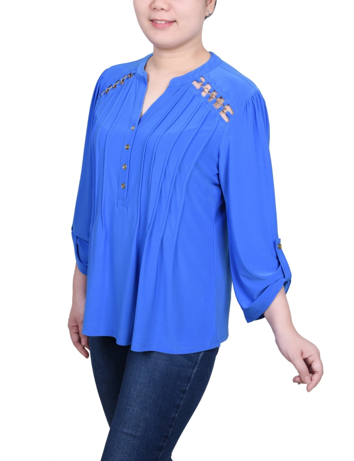 Elevate your everyday wardrobe with this meticulously crafted petite top from NY Collection. Combining modern hardware with classic tailoring, this jersey knit blouse features elegant pintuck detailing and eye-catching shoulder cutouts accented with polished chain links. Designed specifically for the petite frame, it offers a flattering silhouette that transitions effortlessly from the office to evening outings.