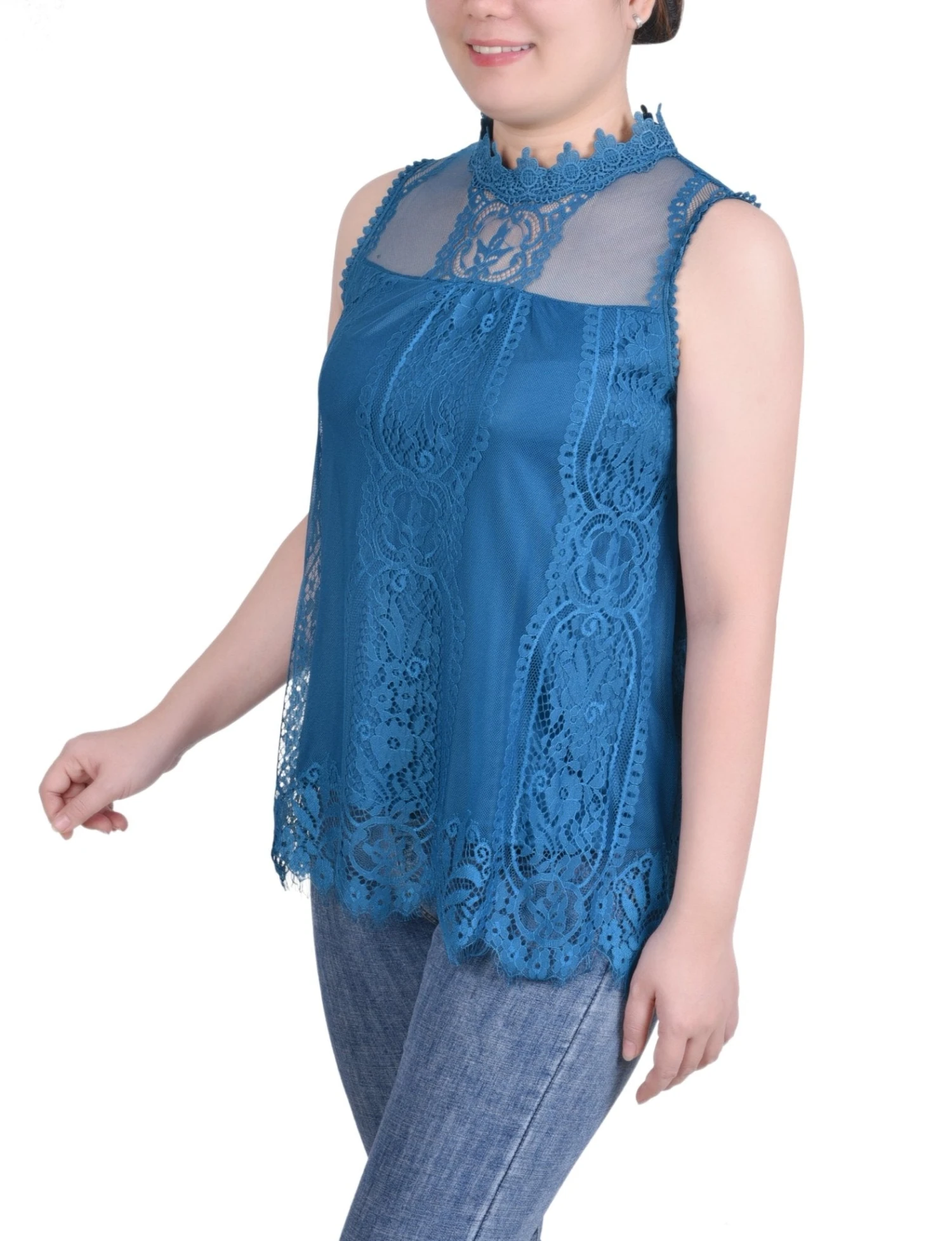 Make a sophisticated statement this season with the NY Collection Petite Sleeveless Mock Neck Lace Top. Designed to offer timeless elegance, this versatile piece works beautifully as a refined layering essential or as a standout solo top for your next special occasion.