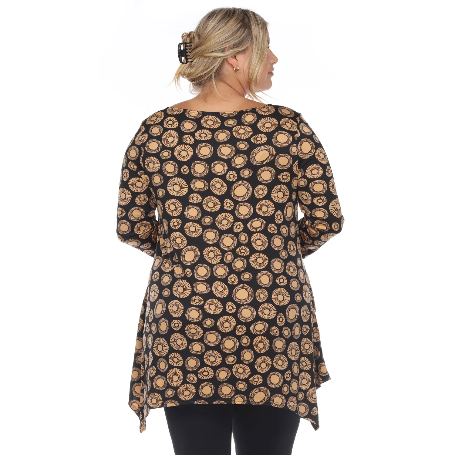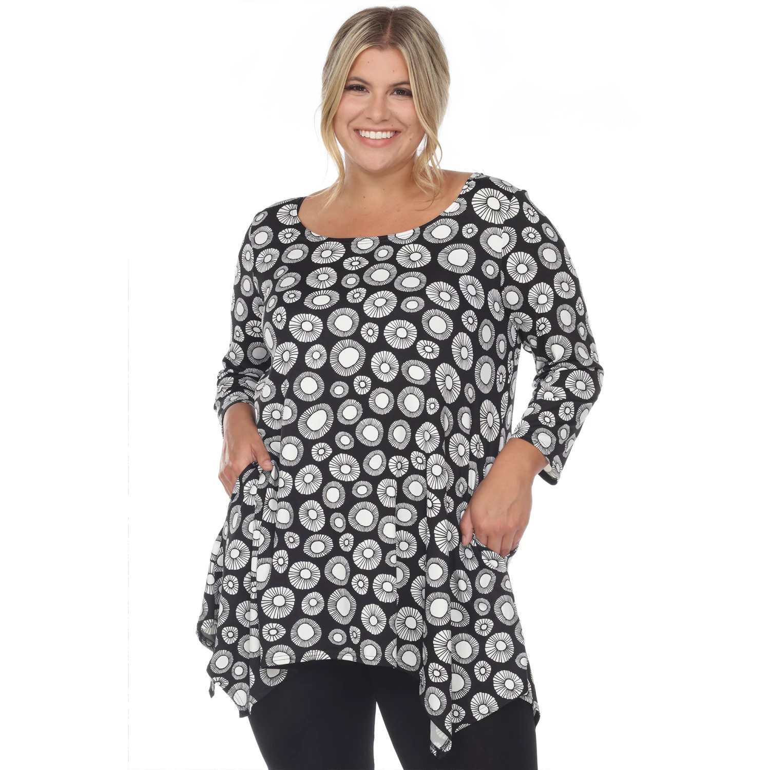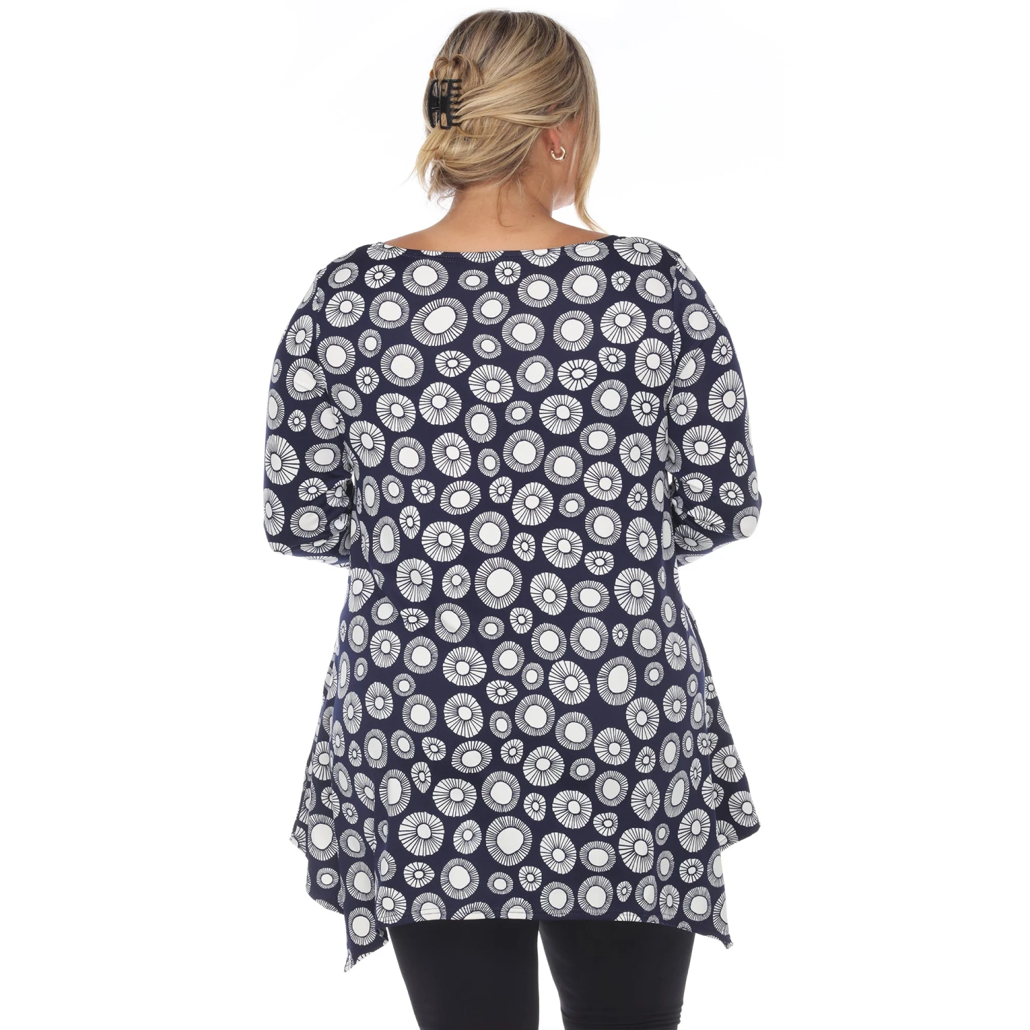 Elevate your wardrobe with a piece that balances bold artistry and functional design. This plus-size tunic features an eye-catching geometric circle print and a flowing silhouette, making it the perfect solution for those seeking a stylish yet comfortable outfit that transitions effortlessly from the office to the weekend.